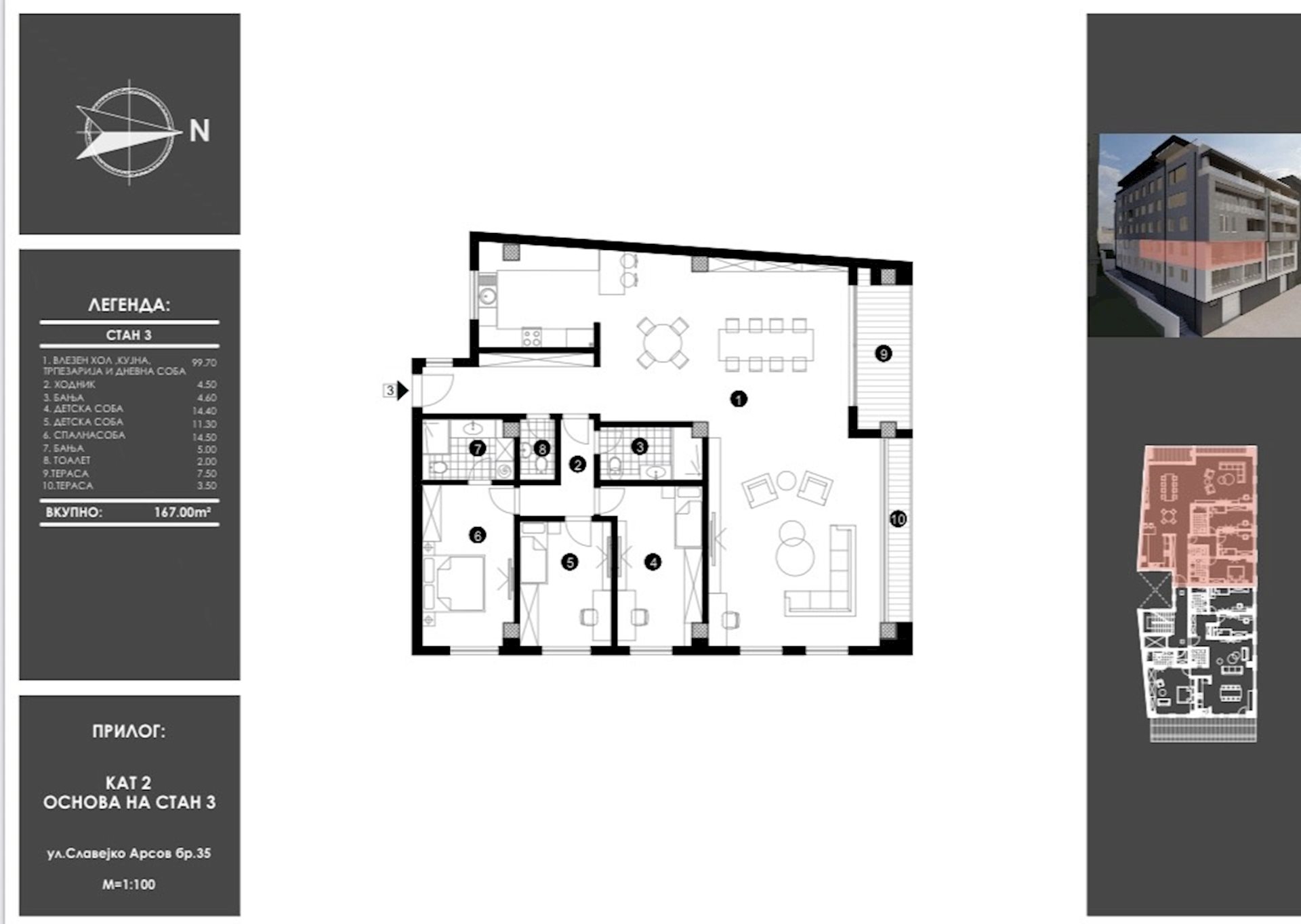 Станот е со вкупна квадратура од 167м2 со пространа дневна ,3 спални, 2 бањи, тоалет и две тераси.