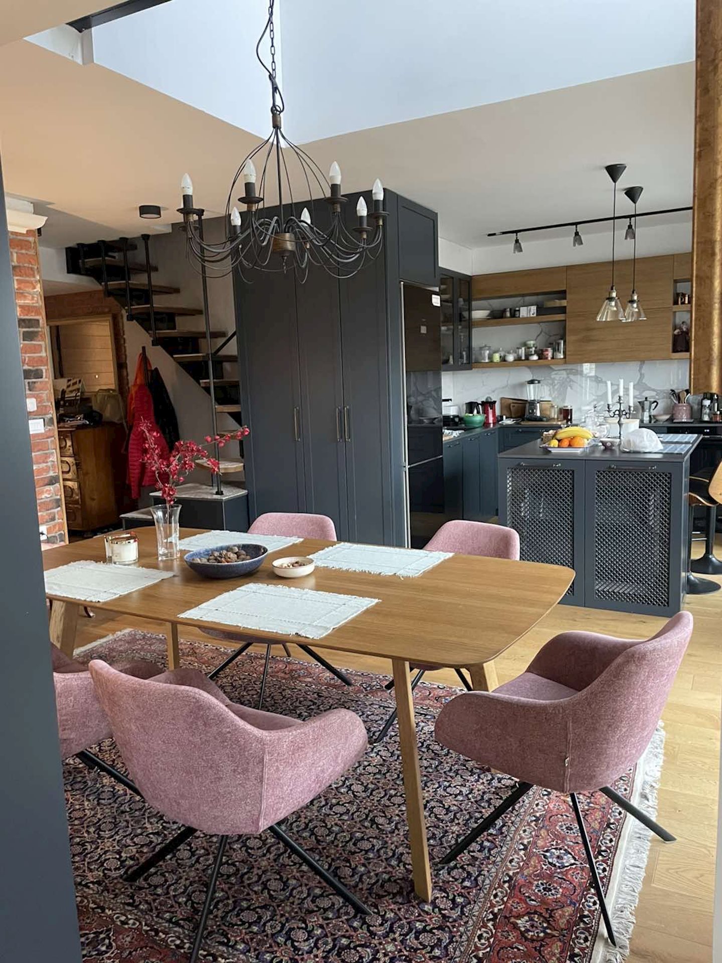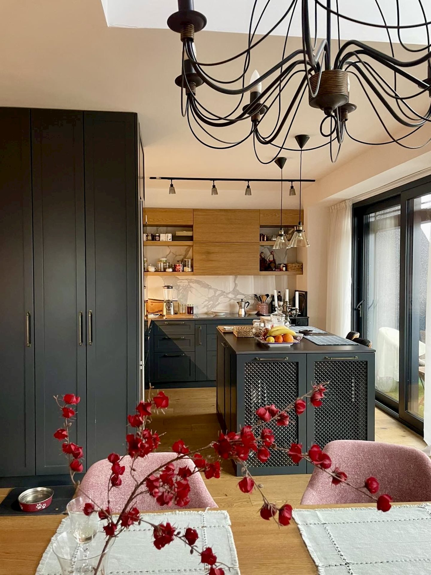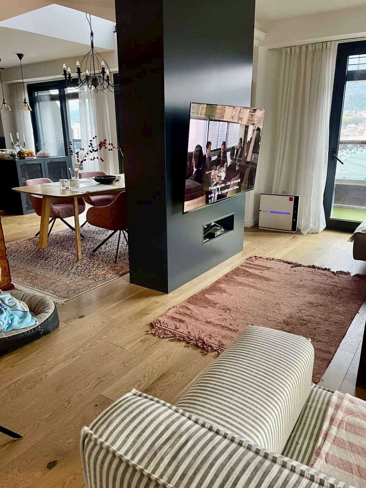 An impressive open-space concept featuring a living room, dining area, and kitchen, seamlessly connected to a terrace with unobstructed views of Vodno. The space is filled with natural light and openness.