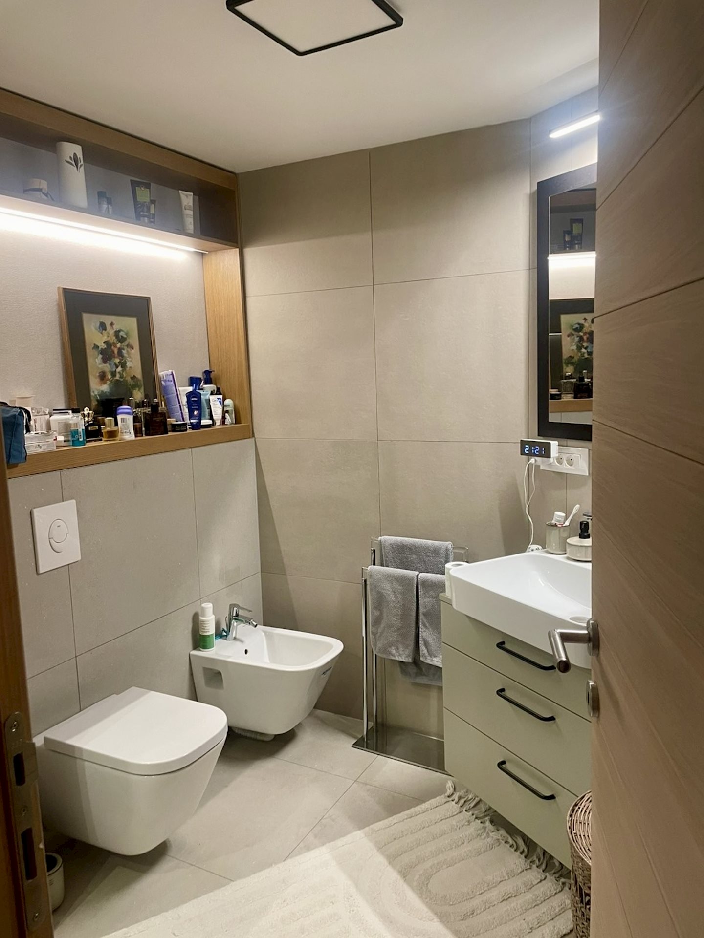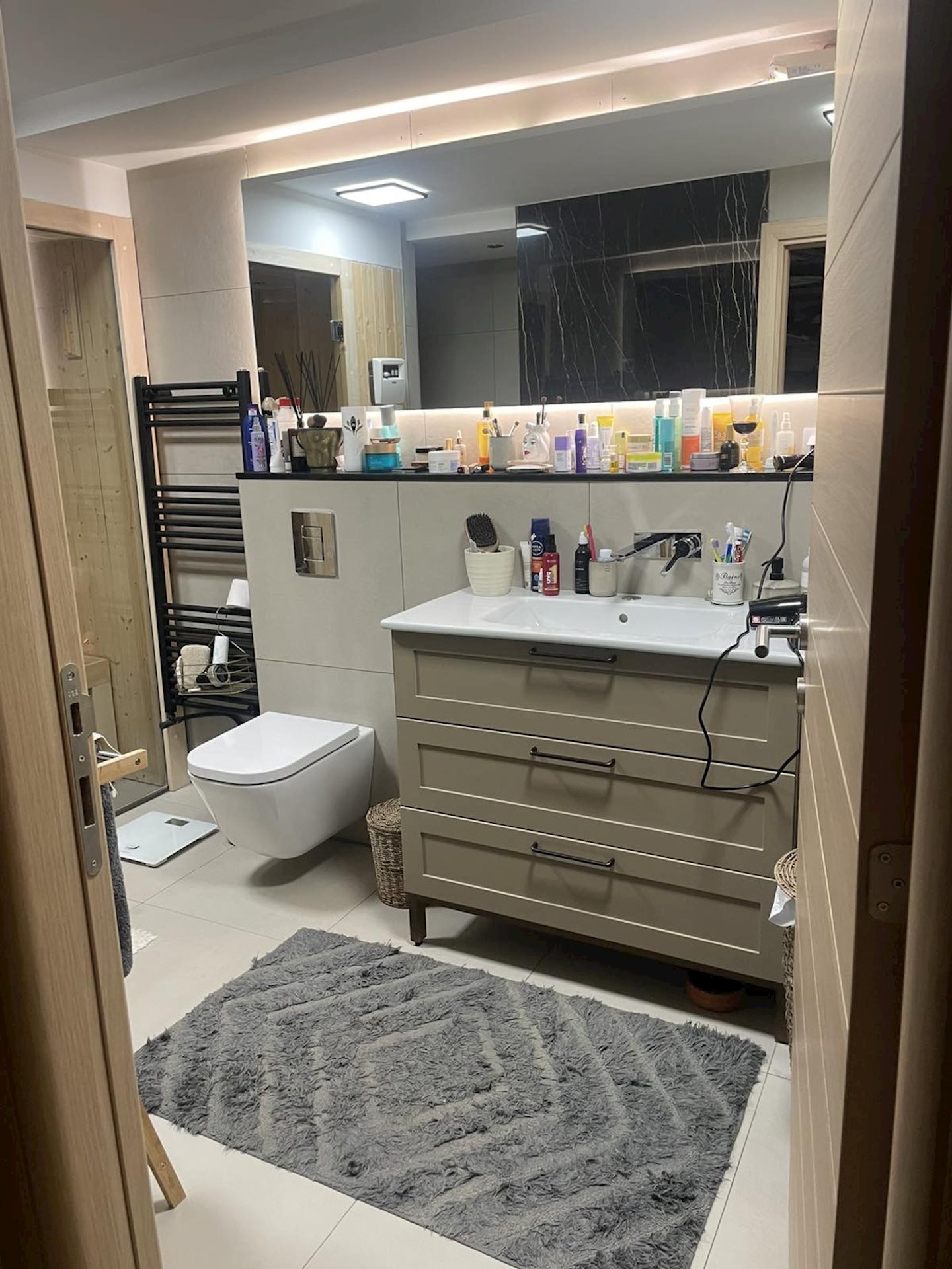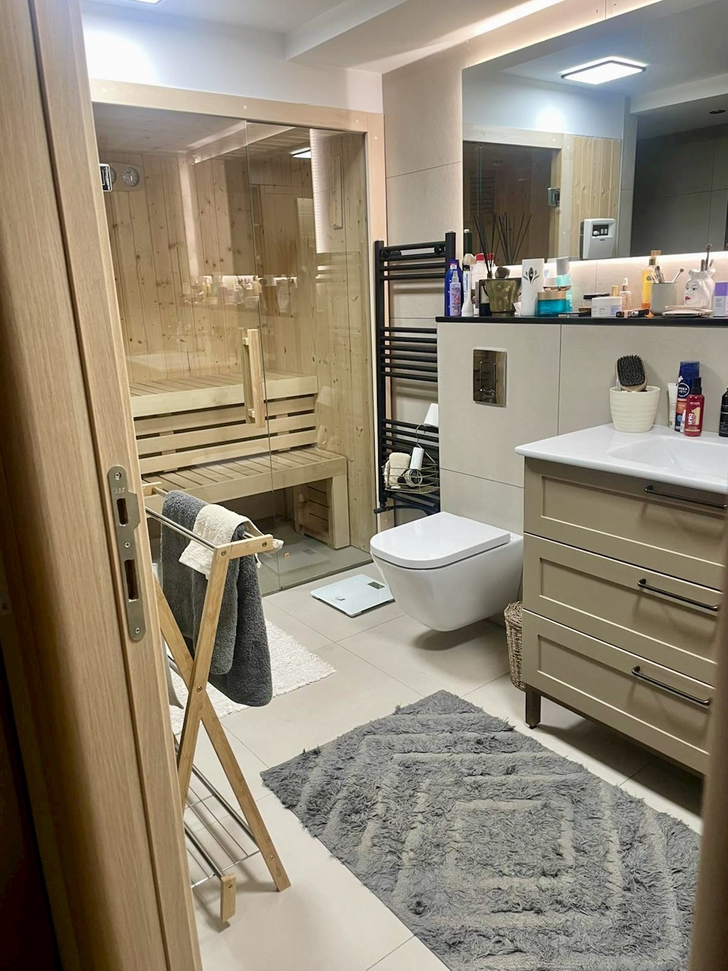 A gallery-style layout leading to two bedrooms, two bathrooms, and a private wellness area with sauna – perfect for relaxation and comfort.