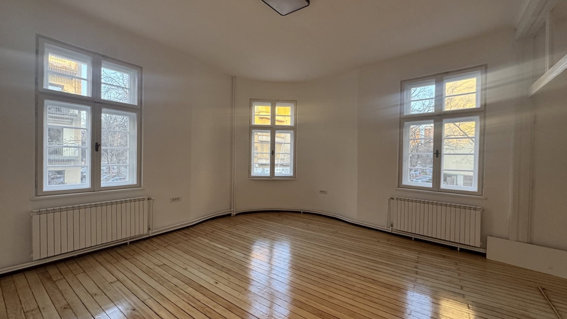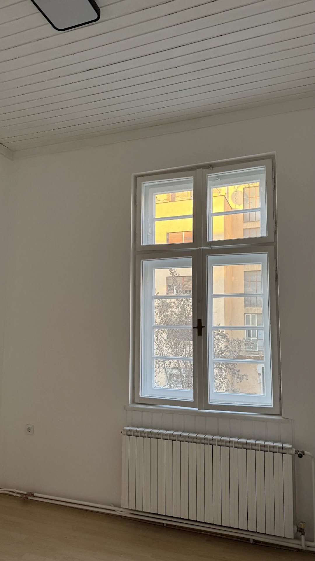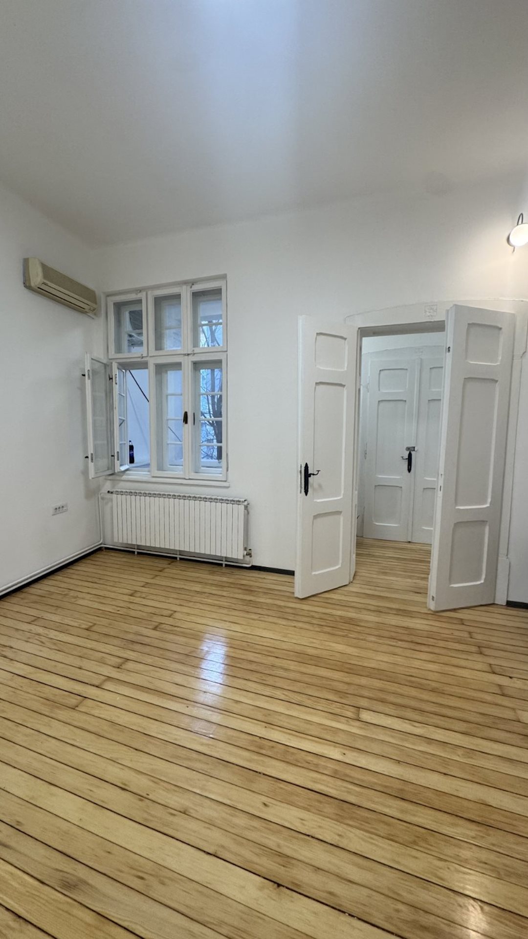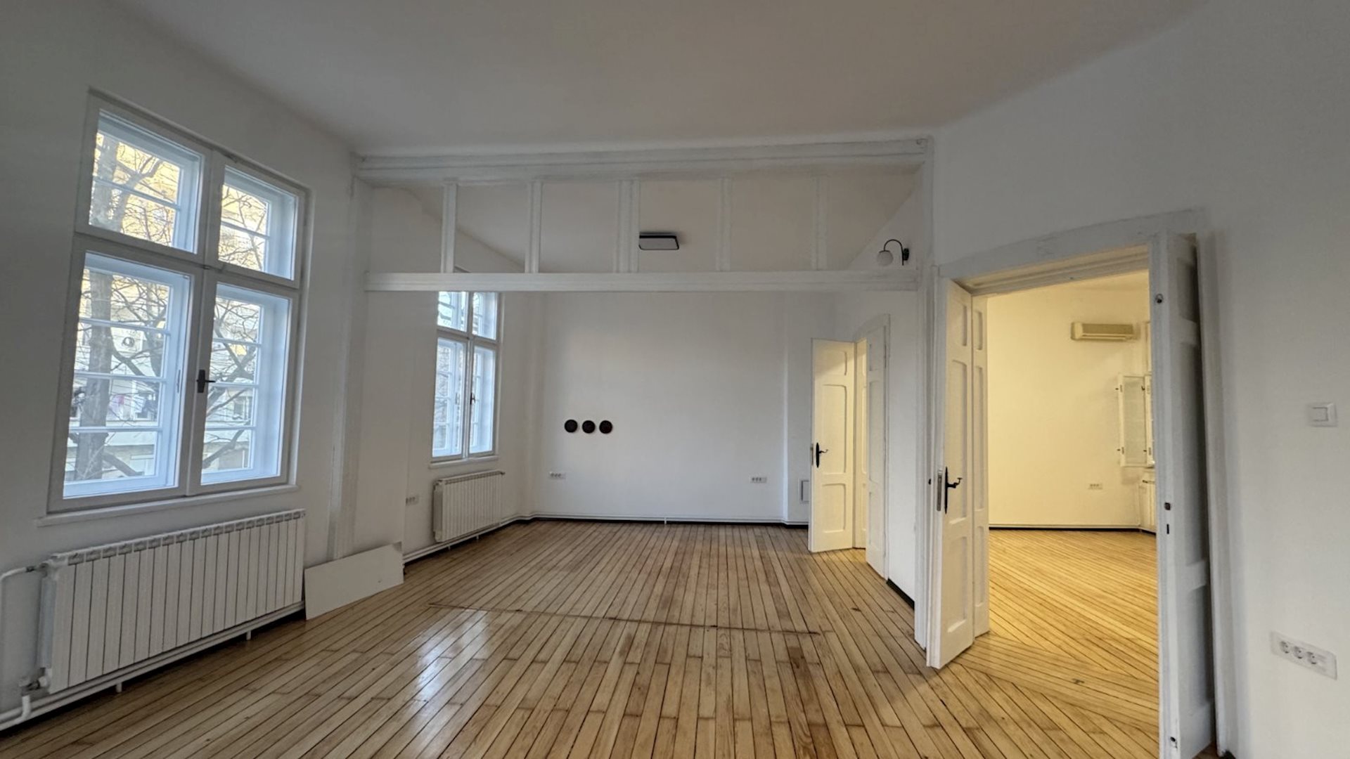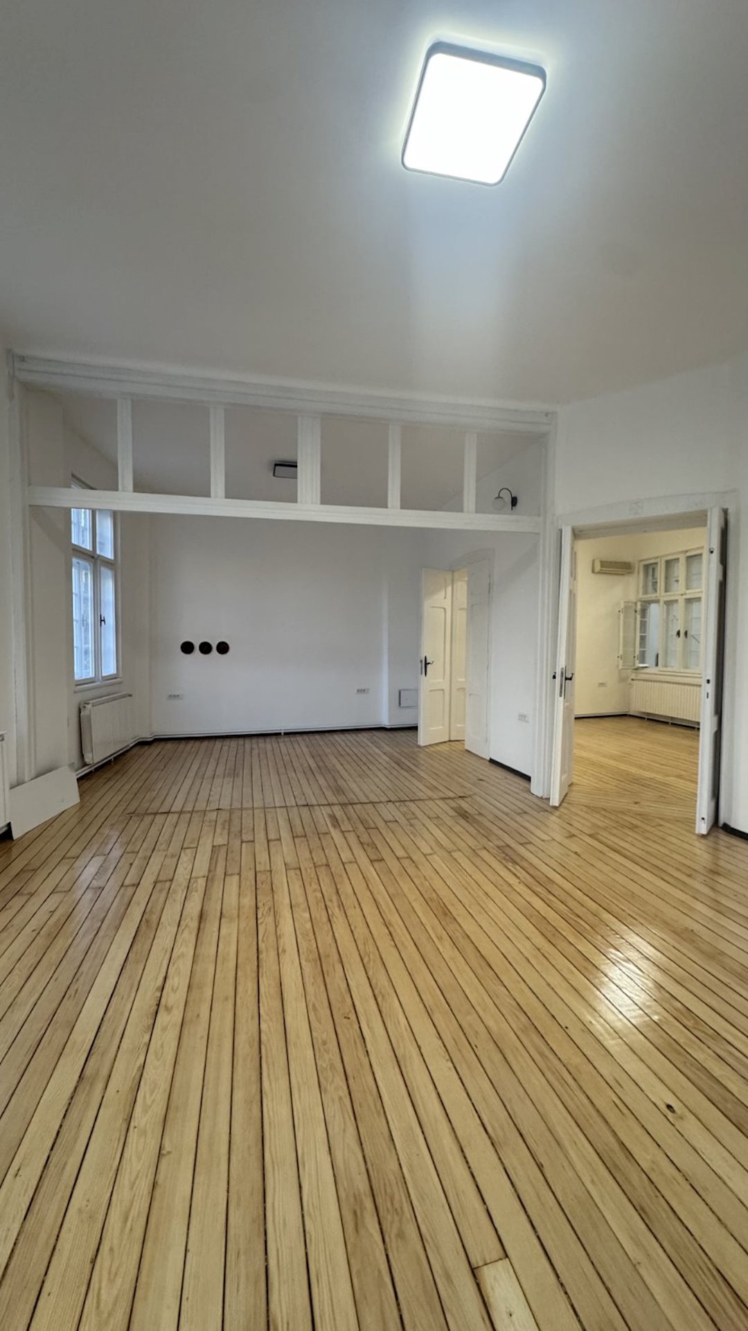 Excellent apartment for rent, with an area of 100m2, suitable for office work or living, in Debar maalo, on the roundabout, near Hempro. The apartment is on the 1st floor, in a building under protection of cultural and historical heritage, with high ceilings of 3.3 meters and central city heating. It consists of four rooms, a kitchen, a bathroom and a terrace. The electrical and plumbing installations have been completely replaced, the windows and doors have been restored and the original hardwood floor has been retained. Network cables have been installed in all rooms, as well as a new lighting. Two parking spaces for residents, with a POC agreement are provided, with the rent of the apartment.