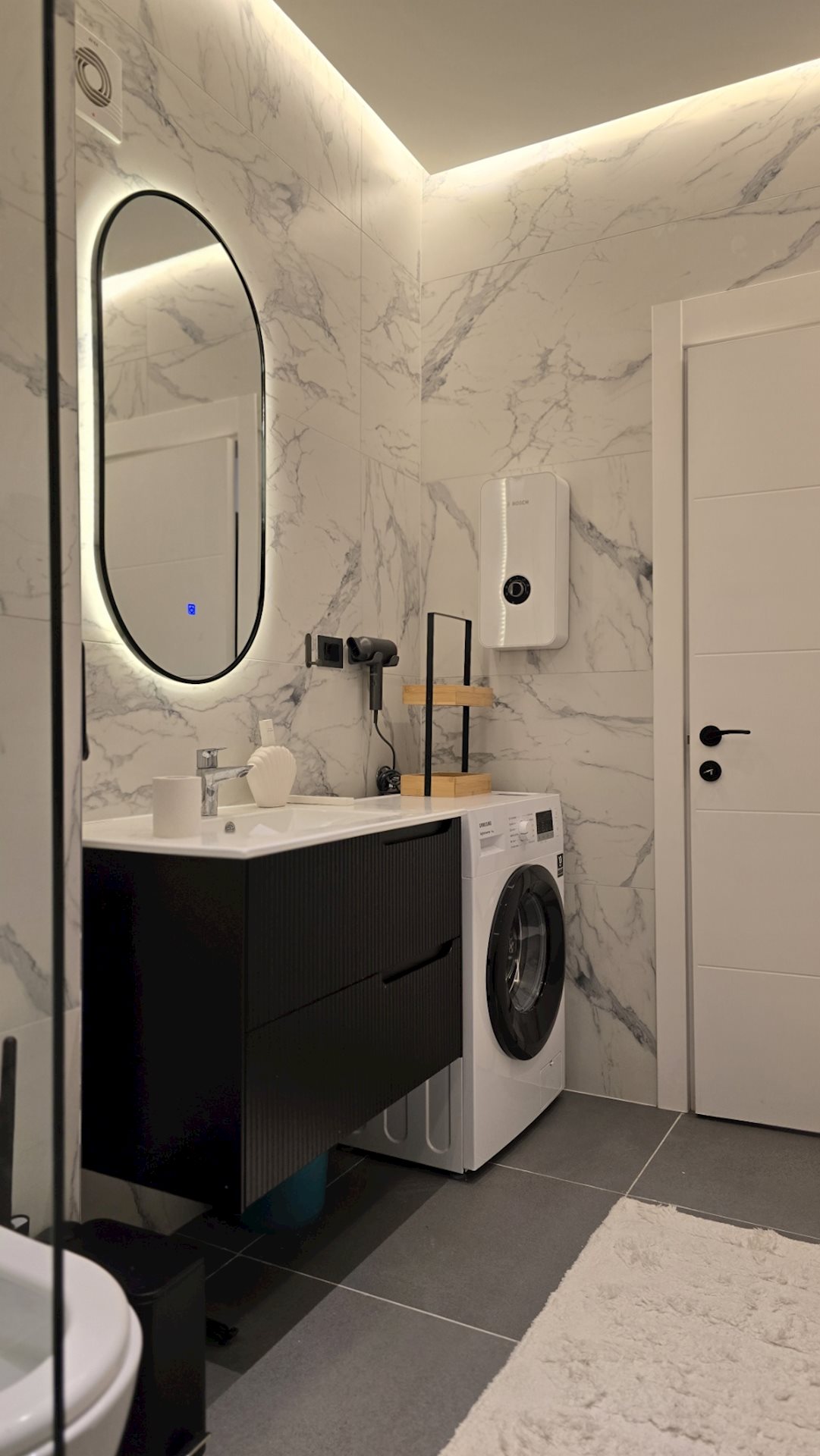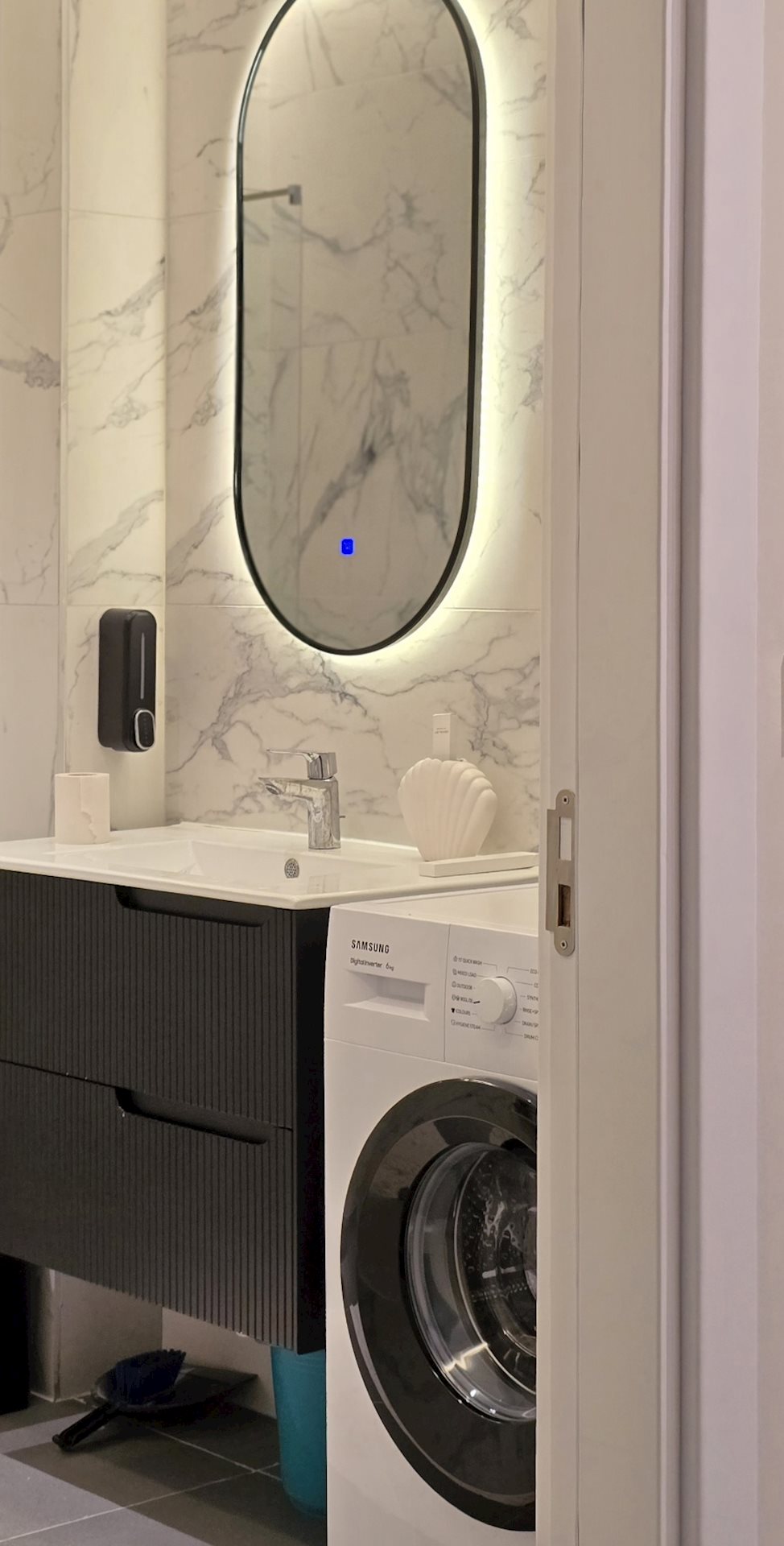New and never occupied apartment for rent, near the Catholic Church, in center. The apartment has an area of 45m2, on the 3rd floor (of 5 floors), in a new mini building, with an elevator. It consists of a living room with a kitchen, one bedroom, one bathroom and a balcony. Fully furnished with new furniture, city floor heating, one garage parking space and two bicycle parking spaces.